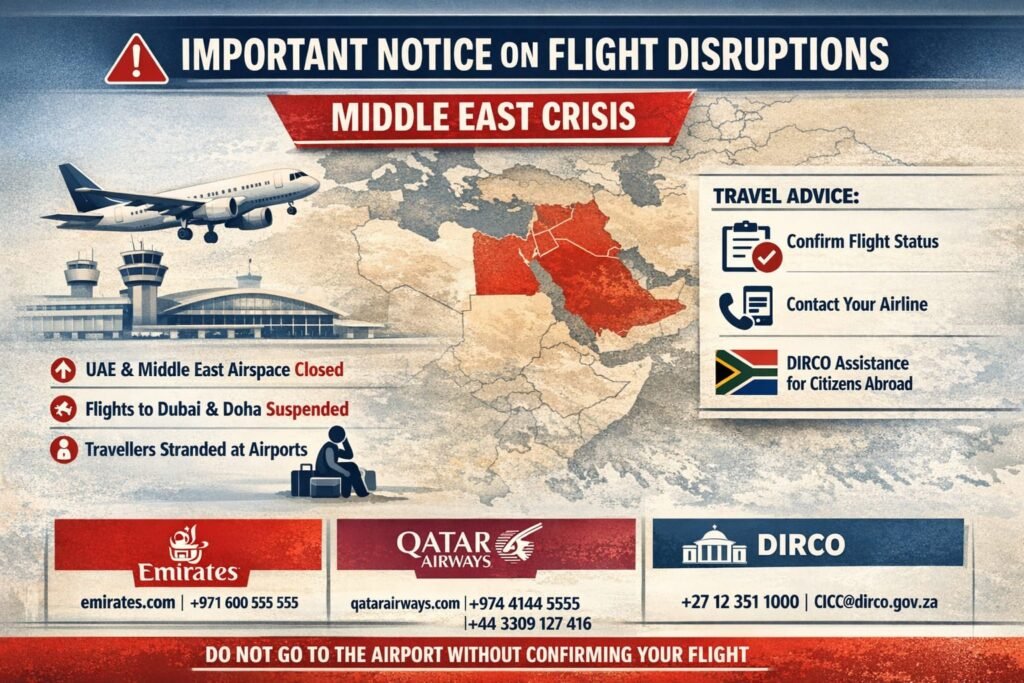 Airports Company South Africa (ACSA) confirmed ongoing global flight disruptions due to the evolving security situation in the Middle East and the continued closure of United Arab Emirates (UAE) airspace.